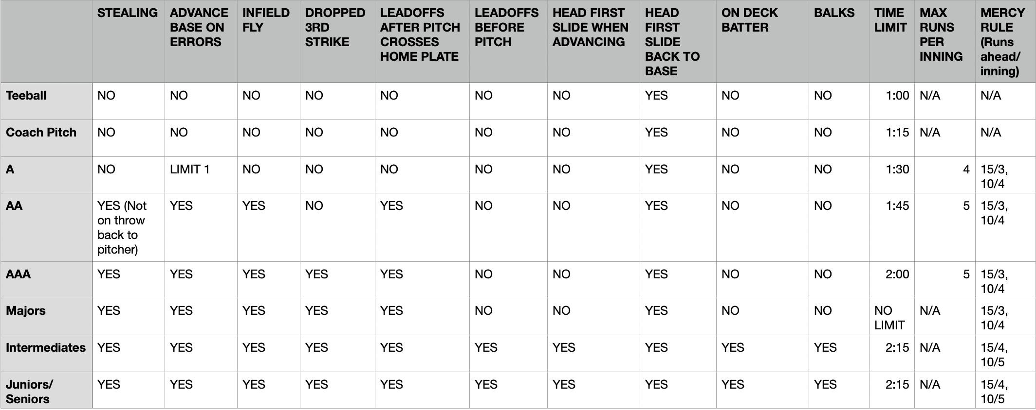 - The upper divisions follow more traditional baseball rules. Please reference tables above for specific notes on rules by division.